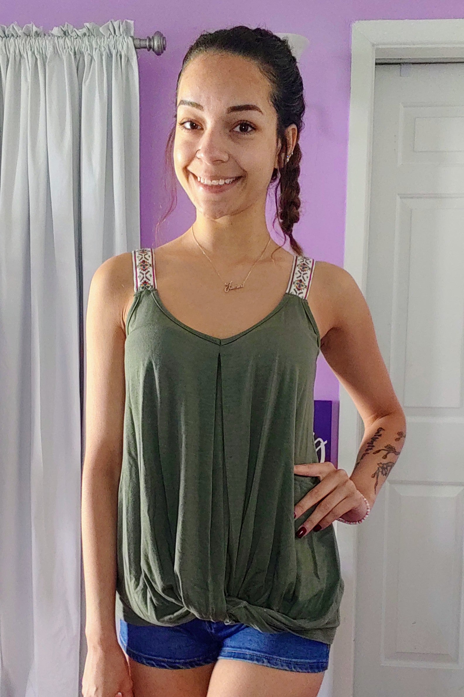 Soft and stretchy, this olive twist bottom tank features fun aztec print straps. Also in Black.