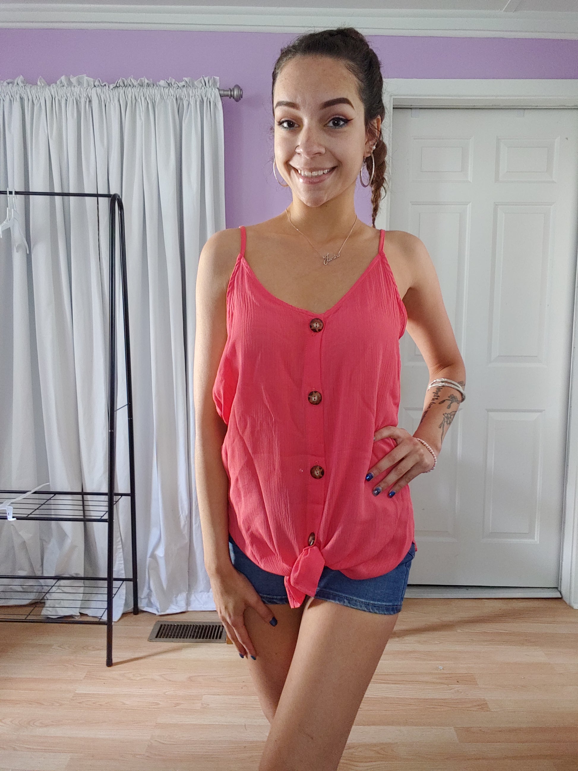 Our newest tank is light and summery. This tank features a real button down front with a bottom that can be tied or untied.