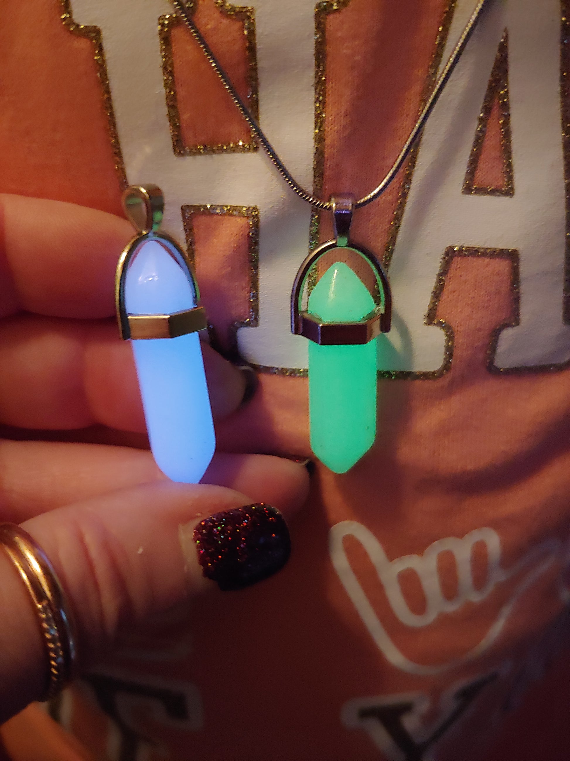 Necklaces are available in silver or black.