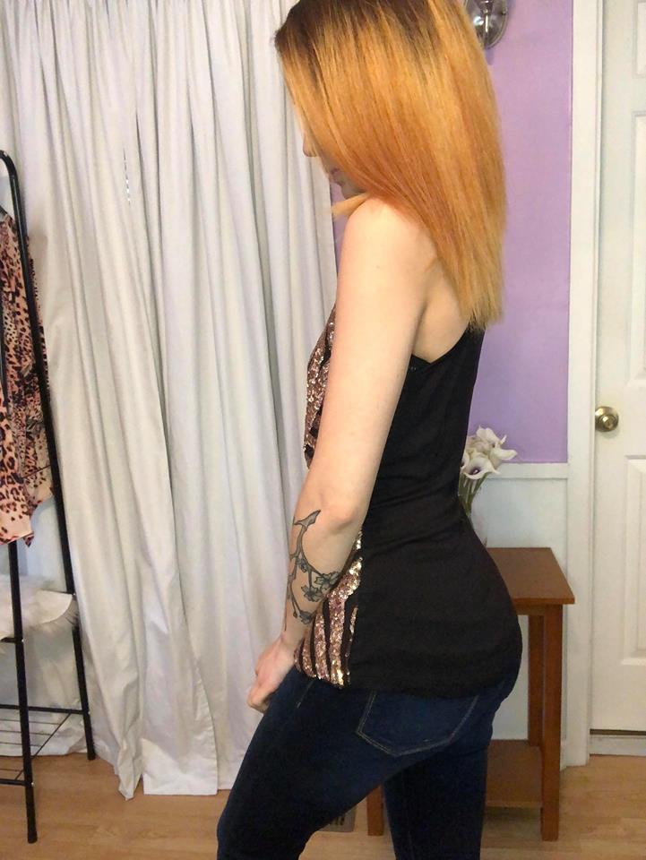 Gorgeous rose gold and gold sequins stand out on this one shoulder style top.