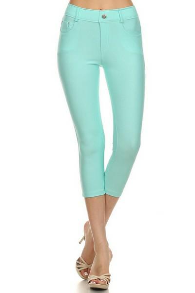 Our favorite jegging is back in Capris for spring! These feature a skinny leg, rhinestone and button embellishments with 5 pockets in a jean like super stretchy material. These will be a staple in your wardrobe! Also in Black, White, and Navy!