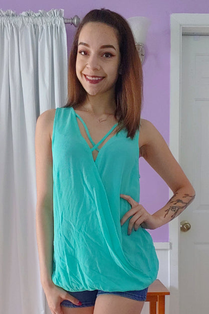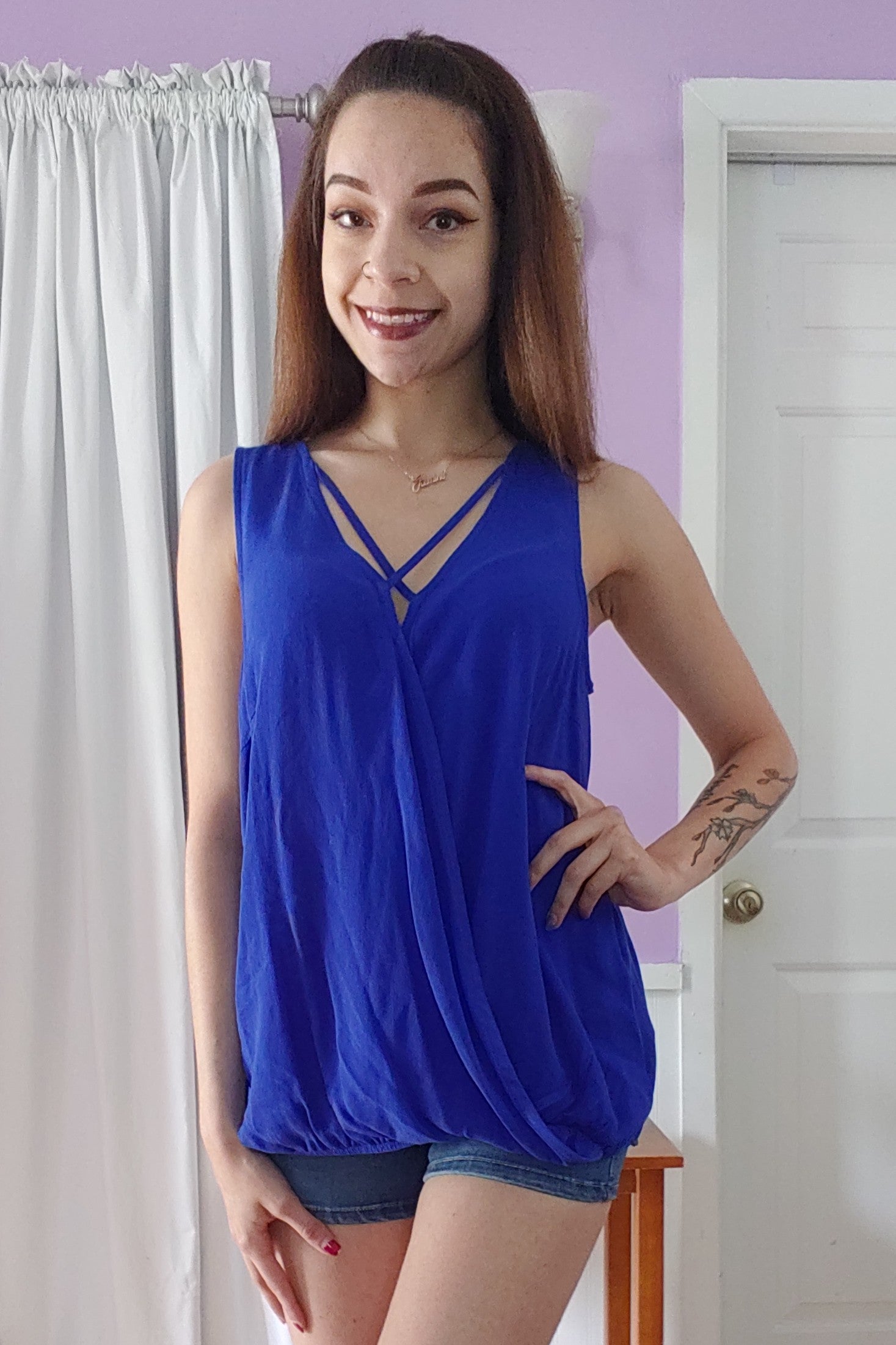 This chiffon tank is a gorgeous royal color (also in Mint here) with an open cross front that is tacked at the top. Features cross straps and an elastic at the bottom for some stretch.
