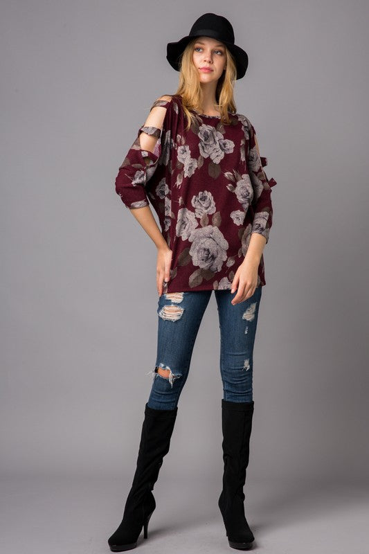 You'll look and feel beautiful in this unique cold shoulder top. Features open shoulders with ladder sleeves and soft thick knit and covers well.