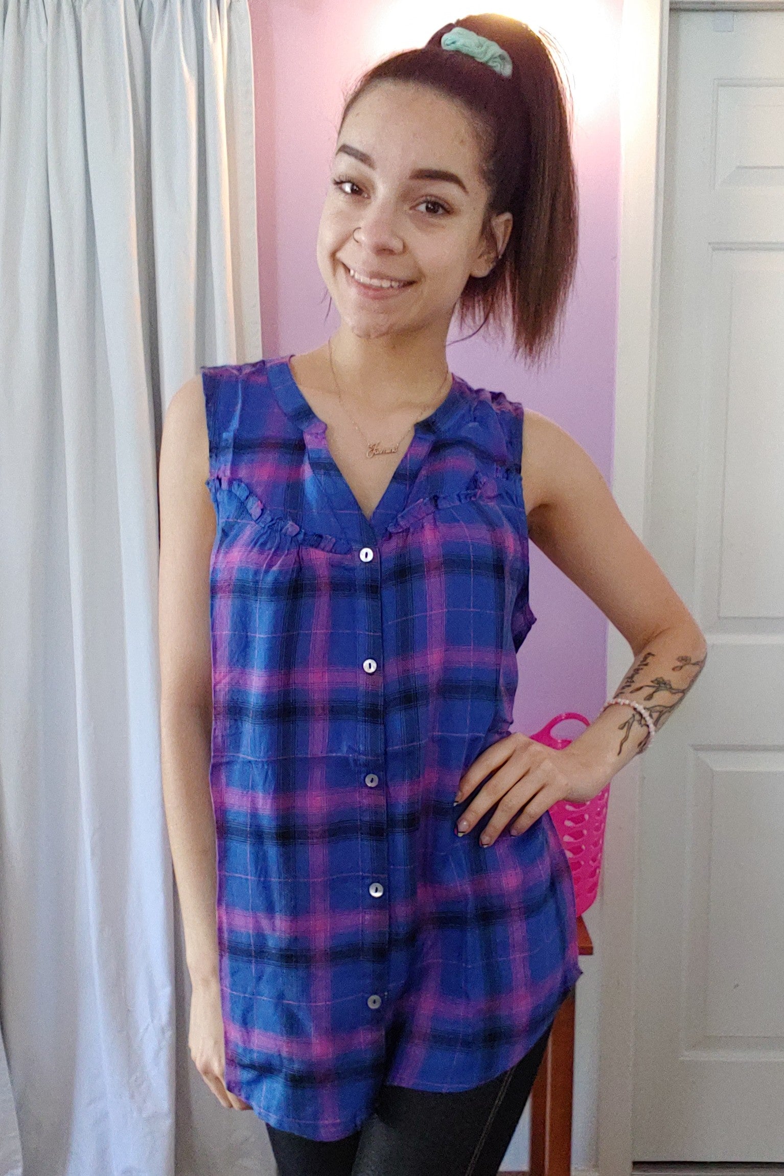 Sleeveless plaid button down top with a V-neck featuring back lace detail and a curved hemline. Fabric is soft and has good stretch.
