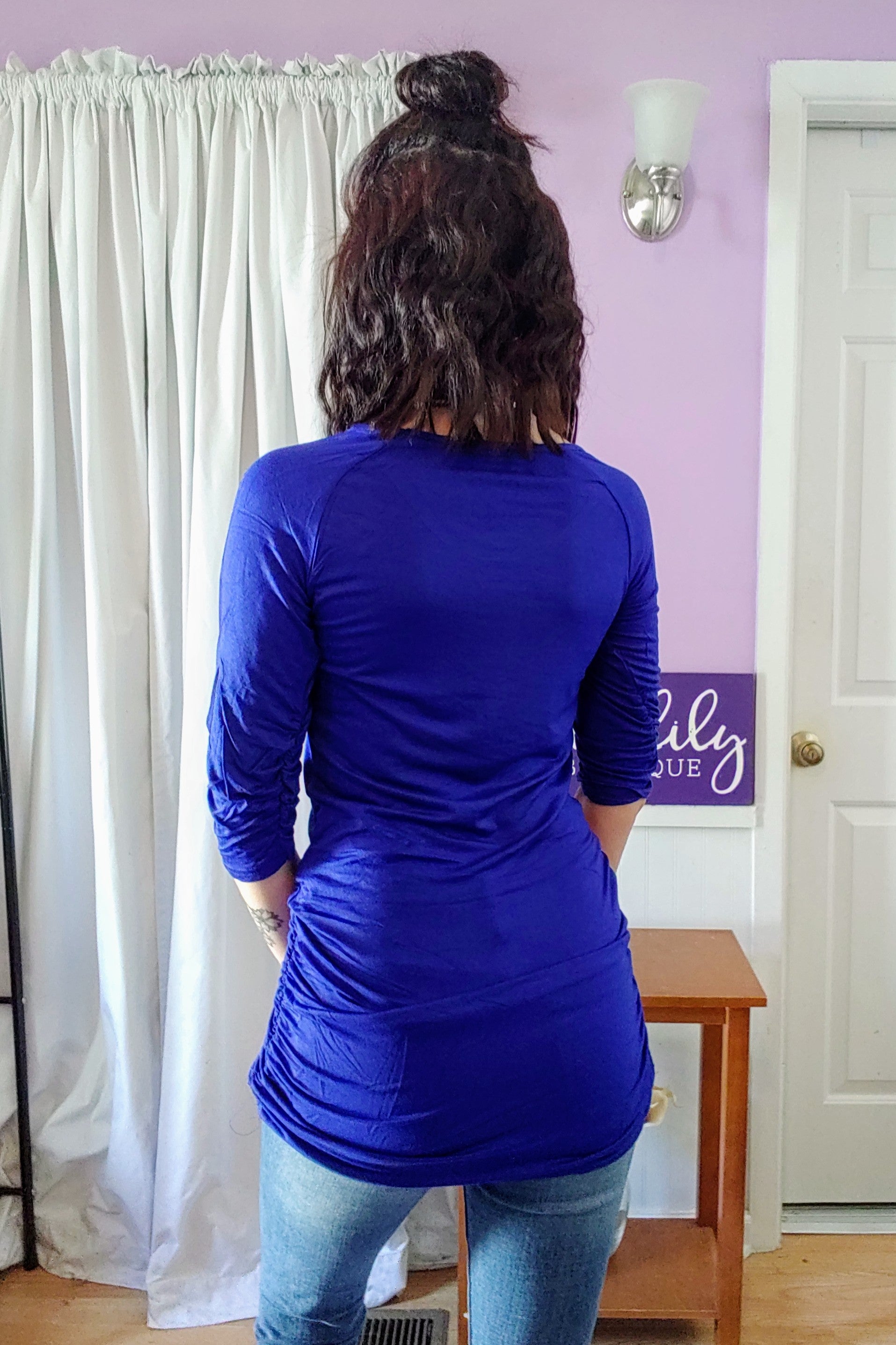 Our favorite new fitted top (in several colors) with a 3/4 sleeve has a stretchy fit. The fabric is soft and comfy.