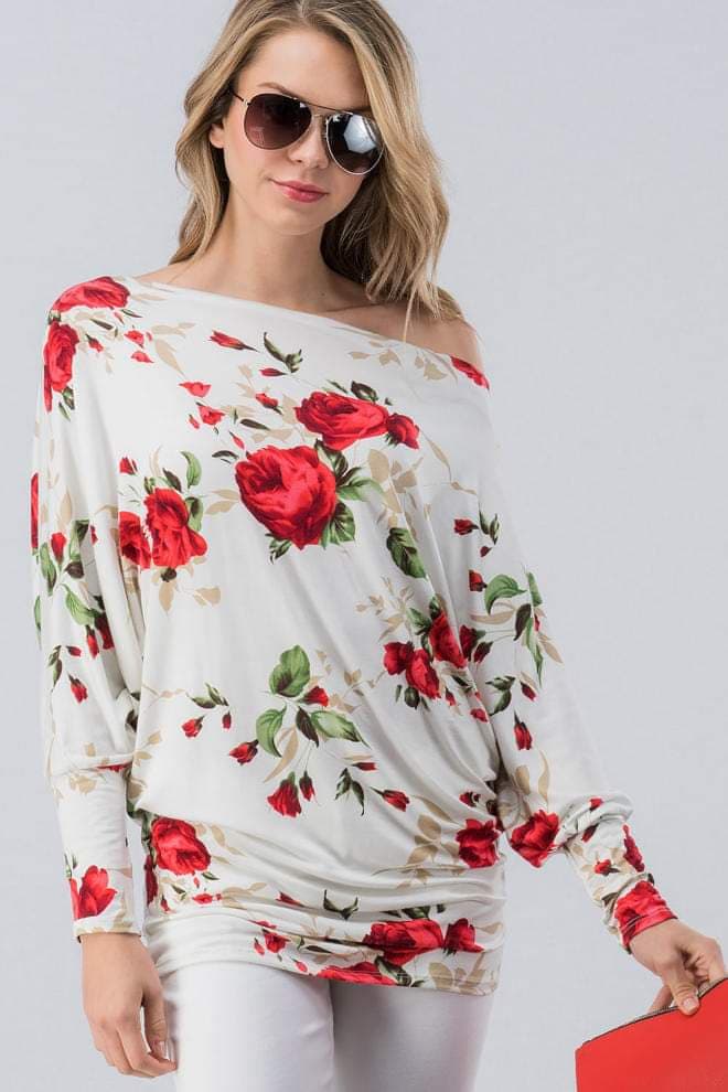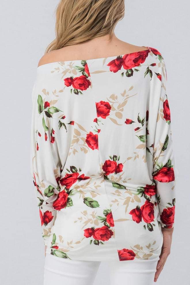 Gorgeous red floral pattern on an off white background. Wear it on both or off one shoulder.