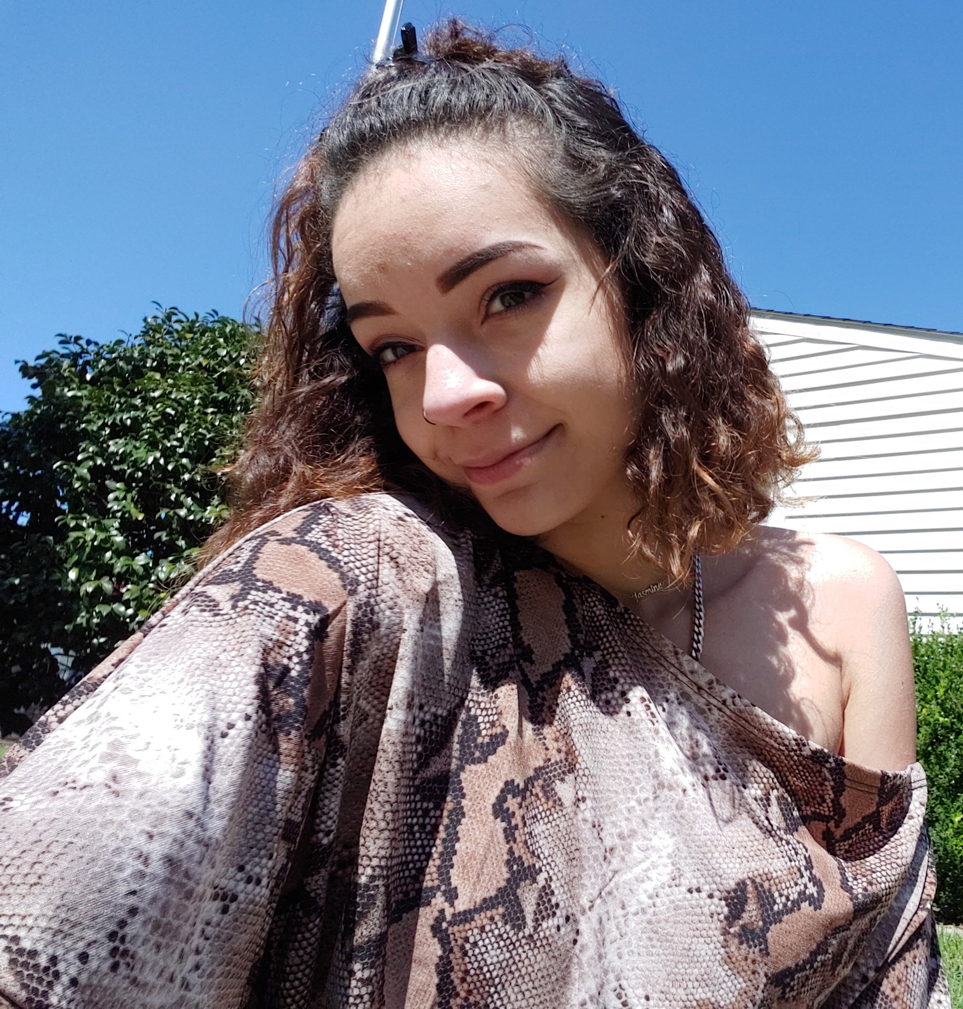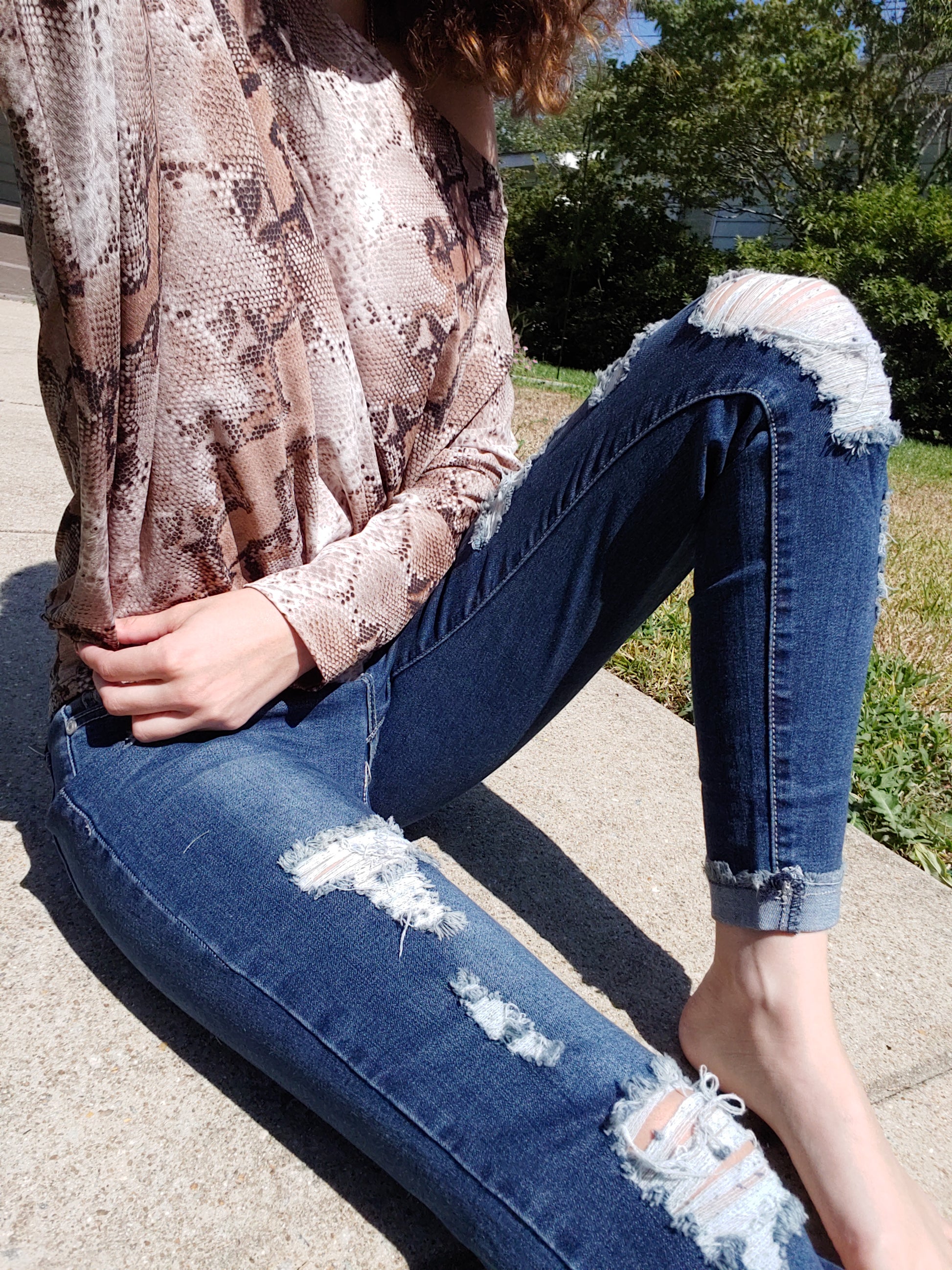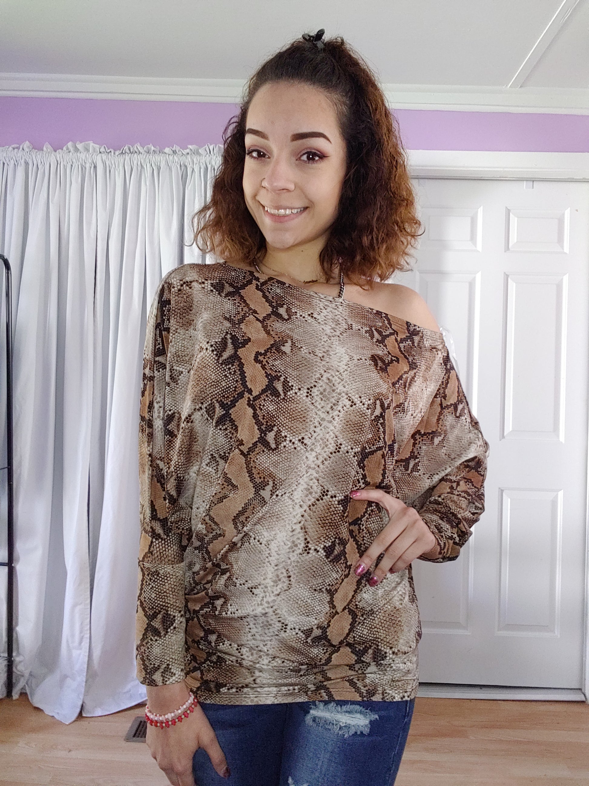 A dolman long sleeve snake print knit top with a boat neck featuring a fitted waistband. Long sleeve, can be worn off one shoulder, off both or on both.