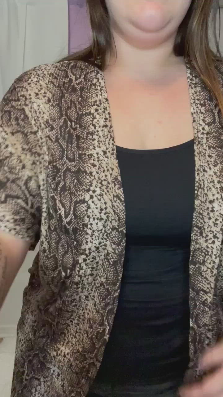 Another transitional piece that is perfect over our tanks or dolmans. This snake print open front cardigan hits below the hips. With a rounded shape it drapes beautifully!