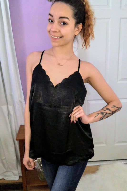 Our simple cami with scalloped hem will look great under cardigans and kimonos as a transition piece for all seasons.