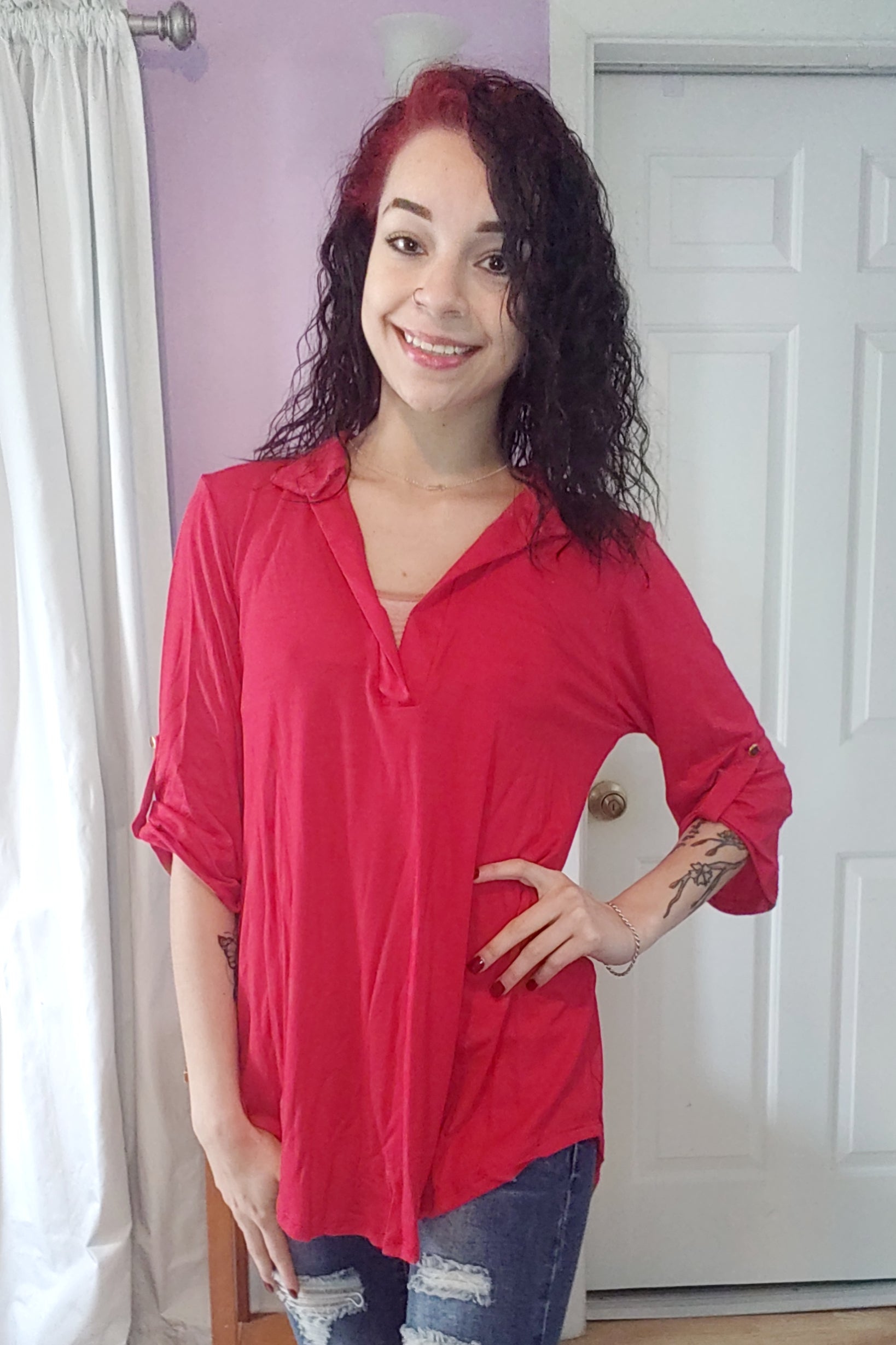 Solid Red top with a mandarin style collar and 3/4 roll up sleeves with tab and button.